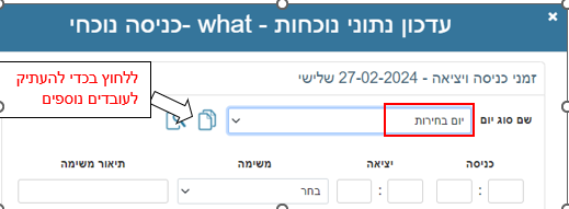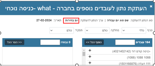 ד. אם ברצונך להעתיק הגדרה זו לעובדים נוספים – יש ללחוץ על האייקון של ההעתקה ובמסך שיפתח לבחור את העובדים שאליהם יש להעתיק את ההגדרה של סוג היום, כך שתחול ביום 27.2.24.