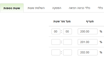 ד. לשונית שעות נוספות – במידה והתעריף של עבודה באותו יום הינו 200% החל מהשעה הראשונה, יש לרשום בשדה “תעריף” 200 ובשדה “מעל מס’ שעות” 00:00.